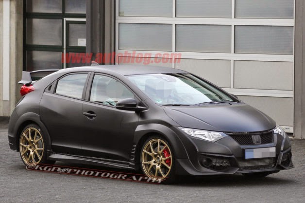Compared to the concept shown at the Geneva Motor Show, this prototype looks even meaner. Check out those big, blistered front fender extensions, taller wing, deeply sculpted front air dam and 10-spoke gold wheels. The Type R certainly certainly isn't hiding its performance intentions, and it has no reason to. Under the hood, we know it packs Honda's new 2.0-liter turbocharged four-cylinder pumping out 276 horsepower, which is likely connected to a six-speed manual.